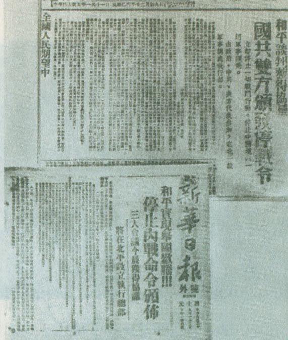 ↑1946年1月10日,《解放日?qǐng)?bào)》和《新華日?qǐng)?bào)》關(guān)于國(guó)共雙方頒布停戰(zhàn)令的報(bào)道。