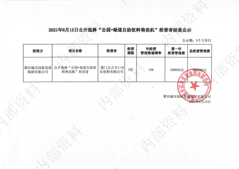 2021年6月15日公開選擇“公園?綠道自助飲料售賣機”經營者結果公示