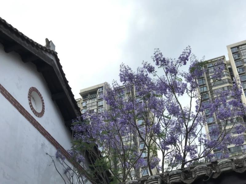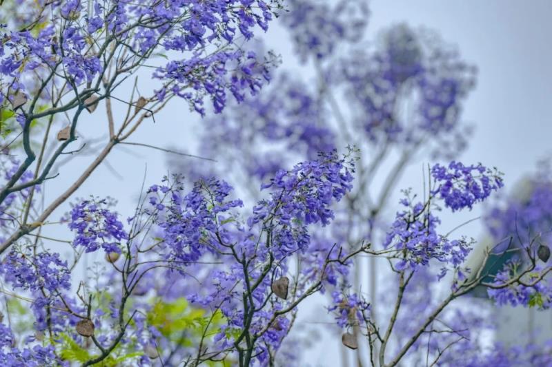 相見(jiàn),總在不經(jīng)意間。 于一片灌木中,于建筑物的墻邊, 藍(lán)花楹撐開(kāi)手中傘,投落道道暗香悠遠(yuǎn)。